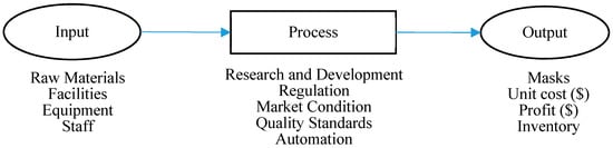 To meet emergency needs in a short time period, the mask production should respond to the needs quickly. The production activity is a set of processes relying on direct input such as raw materials and indirect inputs of capital investment in facilities and equipment and staff (human resources). For transforming inputs to outputs, technology availability, regulation, market condition, a quality standard is one of the essential factors affecting the process as a whole system. The outputs can be measured by the number of high-grade masks, unit cost, and profit of a product (Figure 3).