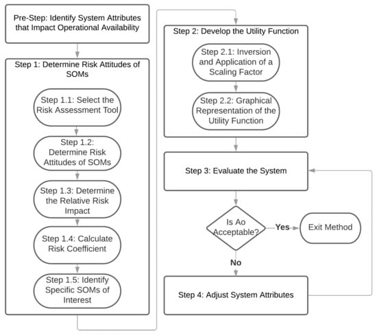 The methodology presented below synthesizes concepts of reliability, risk attitudes, and utility theory to quantify otherwise qualitative characteristics of SOMs as they relate to operational availability. The process consists of a preparatory step and four main steps providing the engineer with a risk-attitude-adjusted insight into the system’s utility as determined by a system value parameter, which in this case is system or component reliability. The method has a provision for systems engineers to use the output of the first three steps to inform any necessary iterations to the system design process. As systems engineering is an iterative and recursive process, it may be necessary to perform steps three and four until reaching a satisfactory outcome. Figure 1 graphically shows the steps of the method.