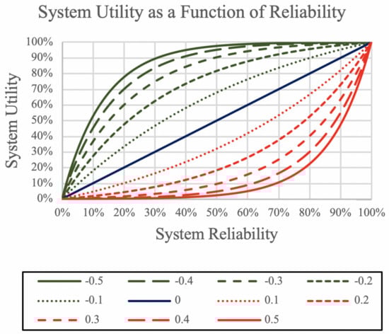Figure 2. System Utility as a Function of Reliability for a Variety of Monotonically Increasing Exponential Utility Functions with Varying ρ Values. Negative (Green Line) ρ Values Indicate Risk Aversion While Positive (Red Line) ρ Values Indicate Risk Tolerance. Note that the Utility Functions are Exaggerated for Demonstration Purposes.