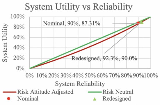Figure 4. Risk-Adjusted System Utility as a Function of Nominal System Reliability for an Example Maritime System.