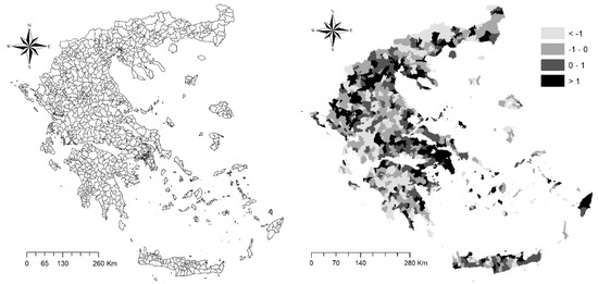 All these works also document the intrinsic opportunities of using municipal spatial units to exploit the particularly rich information associated with official statistics (mainly derived from population and housing censuses), which is clearly an additional reason supporting the adoption of these spatial domains in the analysis of demographic resilience. This information is especially reliable when municipal boundaries are stable over a sufficiently long time [72], indirectly allowing consolidation of specific socioeconomic traits according with the territorial context [74]. Taken together, our study was based on the rationale mentioned above. Homogeneous census data at the spatial scale of municipalities were provided by EUROSTAT for every ten years between 1961 and 2011. Population data were homogenized, taking account of changes in municipal boundaries all over Greece. These changes involved a rather small number of local units and mostly included fusion (or splitting) of neighboring units with comparable territorial characteristics, forming new local administrative entities where communities with similar demographic, social, and economic traits are settled. Based on the results of earlier studies [72,74,85,91], these conditions seem to be appropriate for the analysis developed in our study and highlight the intrinsic trade-off between statistical availability and socioeconomic reliability of comparable population data over long terms [70,81,88].