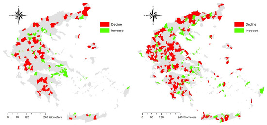 Spatial distribution of Greek municipalities by demographic resilience class; (left): ‘resilient’ (green) and ‘fragile’ (red) municipalities respectively experiencing five (‘increase’) and zero (‘decline’) decades with population growth; (right): ‘quasi-resilient’ (green) and ‘quasi-fragile’ (red) municipalities experiencing four (‘increase’) and one (‘decline’) decades with population growth.