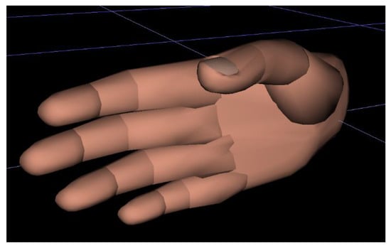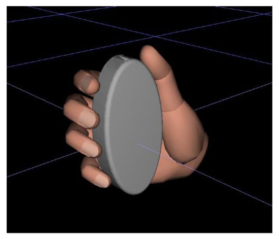 The interaction to be simulated was a user grasping the device with the thumb in a resting position (Figure 1). This interaction requires evaluation because of the prevalence of joint restrictive comorbidities such as arthritis [,]. Jack’s disembodied hand module was used to simulate interaction with the device. The disembodied hand module is a replica hand where each finger and thumb are comprised of 3 segments. The fingers have 3 degrees of freedom and the thumb has 4.
