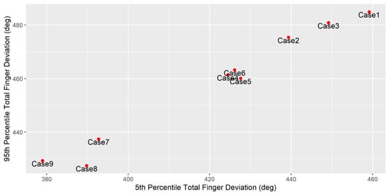 It may be useful to visualize the performance variables, as shown in Figure 3. Total finger deviation is plotted for the 5th and 95th percentiles hands.