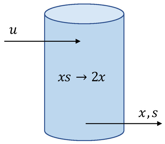 Consider a continuous stirred tank reactor for biomass production held at a constant temperature [30]. Concentrations of feed or substrate are denoted by s and those of the product by x (Figure 2). The reaction describing the inflow and outflow of substrate and outflow/harvesting of product is given by . The reaction describing the growth of product by consuming substrate is given by , where reaction constant k is described below.