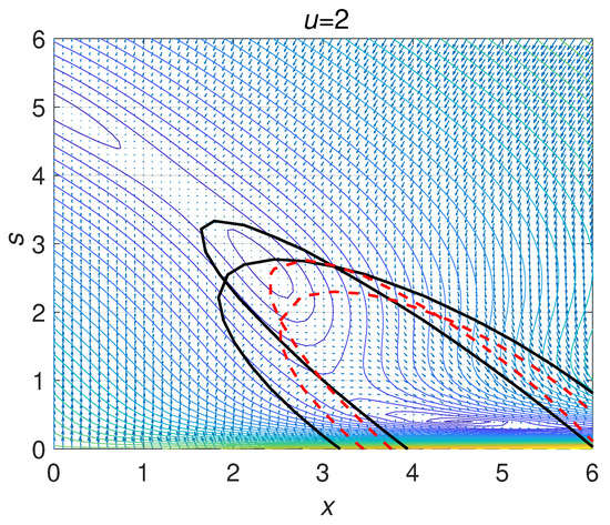 The boundary of the set is given by . Figure 3 depicts the sets defined by and . Their boundaries are given by the dashed red lines. For , programme (17) is infeasible and remains so even after increasing the degree of polynomials , , and . Note that outside the regions, whose boundaries are given by the dashed red line in Figure 3, one might risk washout or depletion of product by being attracted to the equilibrium point given by and .
