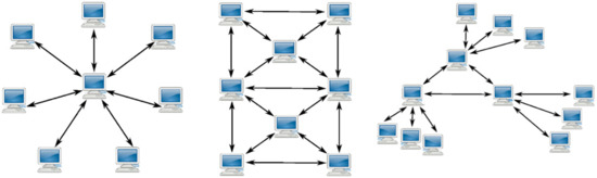 Distributed architecture of blockchain (right image) (left, centralized; centre decentralized).
