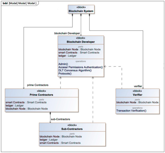 When considering the implementation of blockchain technology within SE, the composition of the SoS or system must be understood from the perspective of the organization wishing to implement the technology by the blockchain developer. Systems architecture patterns are a proven way to define interconnectivity of systems using different modeling languages and different styles [89]. Architecture patterns are diagrammatically represented using object-based modeling languages such as the unified modeling language (UML) [90], commonly used for software based application developments, or the Systems Modeling Language (SysML) [91], an evolution of UML to include systems-based development models. For high-level depiction of a blockchain system to be implemented within an organization for sharing of data and information amongst a heterogenous set of stakeholders and organizations, a block definition diagram (BDD) [92] has been devised (refer to Figure 4). The BDD model denotes a blockchain system higher-level construct, which is made up of a blockchain developer, a prime contractor, a set of subcontractors, and a verifier. The prime contractor would typically be an organization wishing to implement a blockchain architecture, and thus would either develop the distributed ledger in-house or delegate this responsibility to an outside agency who specialize in blockchain development and integration. The developer then designs a blockchain system that integrates a selected set of parties and organizations (in the case of a consortium or private blockchain where all members are known) and assigns the connection credentials and their roles and rights with operating within the blockchain. The BDD also shows a verifier, which implies some sort of consensus algorithm be designed within to verify the transactions and data exchanges amongst the nodes.