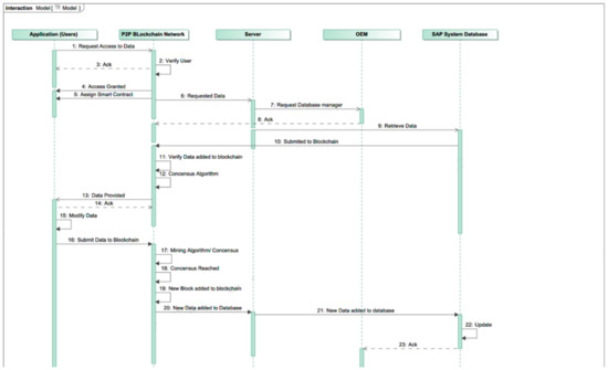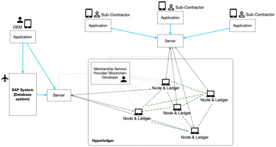 Studying the permissioned blockchain in greater detail, it can be noted that the relationship between the nodes is key to the success of the blockchain’s application, as consensus is paramount for any transaction or modification of data to occur. Taking a case study of a Systems Applications and Products (SAP) system in data processing for an OEM in the airline manufacturing industry, it is possible to infer the required steps from an SE perspective, to implement a blockchain structure to add the benefits described earlier. SAP systems are centralized with the control and management of the database being undertaken within the organization, shared amongst different departments (finance, sales, production etc.). SAP systems, like most centralized data systems, are effective in eliminating duplication and redundancy in data, providing information across multiple departments. However, it is not so good from an SoS context, where multiple organizations must collaborate and share data in real-time to achieve certain tasks. Therefore, integrating blockchain technology must move away from a centralized architecture and allow for collaboration in a decentralized and distributed manner. As the architecture in Figure 6 shows, the SAP system is connected with a hyperledger (blockchain) that is made up of a known set of nodes (participants), via a server mechanism, which allows the blockchain to access data from the existing database. Consequently, the aircraft OEM can, via an application, access the database, which is also connected to the server, which connects them with the hyperledger (Figure 7). Similarly, those outside of the consortium blockchain who wish to interact with the ledger (whether the ledger is retrieving or submitted information) can do so via a server. It is crucial that the blockchain developer has permissions in place to specifically define who can retrieve and submit information.