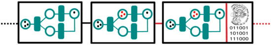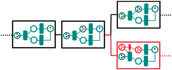 There are a number of ways in which forking can be employed to address the accountability to a single source of truth in industrial applications and development. In Figure 8, the case of a hard-fork is conceptually explored. In the figure, a model of an industrial design (a Petri net [94] in this example) first evolves within the same fork with slight modifications, perhaps representing a parameter optimization procedure that improves the accuracy of the model. At some point in the development, one of the stakeholders may decide to branch the project to investigate a new disruptive technology, represented in the image as a mutation in the Petri net model in red. The new fork may succeed or may be abandoned, but any design or strategic decision can always be traced back within the branches of the ledger. Figure 9 illustrates the applicability of soft-forking towards scalable blockchain usage. In the figure, a soft-fork expands the capabilities of the blocks, which now—besides including a Petri net model—can also include design schematics and additional digital information such as legal documents. The new sub-block may be only accessible to some of the stakeholders through a permissioned mechanism.