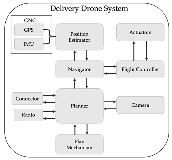 We will use a delivery drone to demonstrate how to construct an AADL model that is analyzable by VERDICT. The AADL source code is publicly available on the Github repository [28]. The drone system architecture is shown in Figure 2. The drone is part of the delivery system that consists of a van with packages to be delivered and one or more of the delivery drones. After the van arrives at a location that is close to multiple delivery sites, the delivery drones are initialized with their current position, delivery location, and the package to be delivered is loaded. After a delivery drone is launched, it uses the inputs from the GPS and IMU to navigate to the delivery location. When the drone reaches the delivery location, it uses its Camera to capture an image of the receiving site to confirm that it is free of obstacles and it is safe for the package to be dropped off. For a high-value package, the Delivery Planner will use the Radio component to get confirmation from the operator in the van. If there are no obstacles on the receiving site and confirmation (if needed) is received from the operator, then the Delivery Planner will activate the Delivery Item Mechanism to drop off the package. The delivery drone also needs to avoid certain airspace, for example airports, schools and government buildings. The Global Positioning System (GPS) and Inertial Measurement Unit (IMU) are subcomponents of Guidance, Navigation and Control (GNC) to illustrate model hierarchy.