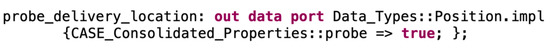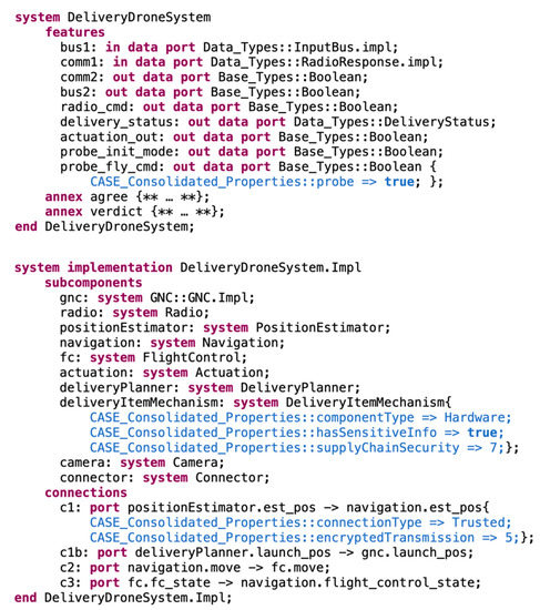 Figure 3 shows a snippet of the AADL code for the top-level delivery drone system type and its implementation (some implementation and connection details are omitted for the sake of space). The system type has a feature section with data port (inports and outports) declarations. The system implementation encompasses various subcomponent instances and internal connections. Each subcomponent is an instance of a system type or implementation.