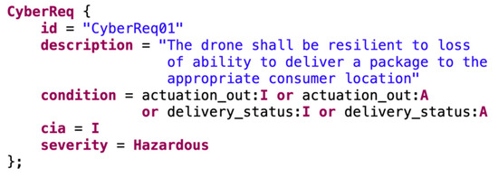 The cyber-security and safety aspects of the system are modeled using the VERDICT annex introduced in Section 3. Cyber, safety, and mission requirements may only be declared in a VERDICT annex within the top-level system type. Cyber and safety requirements can be aggregated and associated to a particular mission requirement. Cyber and safety relations may only be declared within a subcomponent system type. They describe the vulnerability and failure flow, respectively, between the inputs and outputs of an individual component within the system. Safety relations model how faults or (erroneous) events or inputs affect the Integrity (I) and Availability (A) of the outputs. Cyber relations model how cyber-attacks affect the Confidentiality (C), Integrity (I), Availability (A) of the outputs.