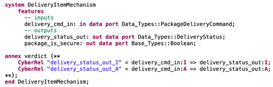 Cyber relations are used to map component vulnerability of inputs to outputs. VERDICT requires the user to declare the cyber relations for each component in the AADL model. Cyber relations represent the relationship of the input and output signals of a component. Cyber relations are defined in the declaration section of the component type in AADL using the VERDICT annex. Figure 6 shows two cyber relations for a DeliveryItemMechanism component. The cyber relations specify that the integrity and availability of delivery_status_out is impacted by the integrity and availability of delivery_cmd_in, respectively.