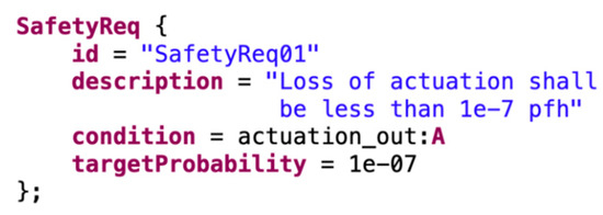 A safety requirement is declared in a “SafetyReq” block. The “targetProbability” field of “SafetyReq” indicates the acceptable probability of failure of the system. Since safety is concerned about undesirable events happening in a system such as loss of availability, a block “Event” is introduced, and the probability of the event is defined in the field “probability”. A safety vulnerability propagation is encoded in a “SafetyRel” block. The “faultSrc” is a logical Boolean expression in terms of happening of events and integrity and availability of inputs of a component. A predicate “happens” is introduced that is applied on an event “id”. The “output” field is a logical Boolean expression in terms of integrity and availability of a single output of a component. The semantics of “SafetyRel” is that the failure of “output” is induced by the failure of “faultSrc”. The “SafetyReq” states that given the “SafetyRel” for a system architecture and the “condition”, the calculated probability of system failure shall not exceed the specified “targetProbability”.
