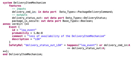 Figure 8 shows a loss of availability (LOA) error event and a safety relation for the DevliveryItemMechanism component in the VERDICT annex. The probability of loss of availability event is 1.0e-8. The safety relation describes that the availability of delivery_status_out is affected by the occurrence of LOA event of the component or if the availability of delivery_cmd_in is affected.