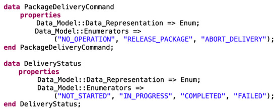 Notice that the enumeration type PackageDeliveryCommand has a value NO_OPERATION, that allows us to distinguish the case where no command is issued, which is required by the system (5). Alternatively, one could use event ports to implicitly model the case where no signal is present and keep the enumeration type with only two values. This modeling choice relies on whether an explicit value is needed to reason about other parts of the system.