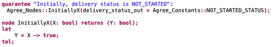 To state aspect (3) formally, we add the following guarantee stating that the delivery status is equal to NOT_STARTED initially, as it is safe to assume that the system starts in a proper initial state. We achieve this by using an auxiliary AGREE operator InitiallyX whose definition is shown in Figure 10.