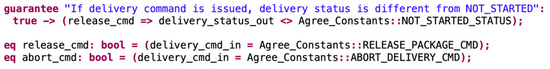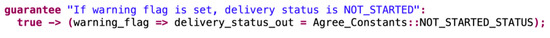 Once we have defined the predicate, we can express the cyber-property with the guarantee in Figure 14, in which started (defined below) is an auxiliary predicate which returns true if and only the delivery has started.
