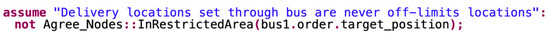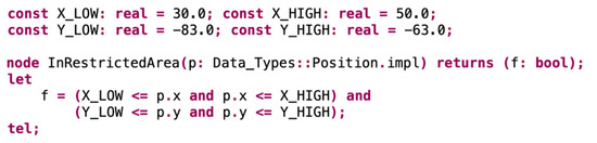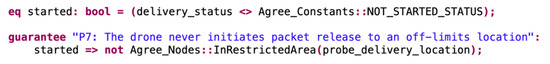 Specifying desired formal property of the system: The next step is to review the list of safety functional requirements for the system that may affect its integrity and formalize them as formal cyber-resiliency properties in the AGREE language. For instance, consider that we are given the following cyber-requirement for DeliveryDroneSystem that regulates when a package could be released: The drone never initiates packet release to an off-limits location (labeled as P7). To formalize the cyber-requirement P7, we must first identify the components and ports of the system that are relevant to the description of the property. In our example, the DeliveryPlanner is the component that issues the command to release a package by setting the output port delivery_cmd to RELEASE_PACKAGE, and the DeliveryItemMechanism is the component that receives the command and proceeds with the delivery. Moreover, to know where the drone should release the package, the DeliveryPlanner reads the delivery location from the input port bus1 through the Connector component when the drone is in the van, and then it passes this value to the Navigation component. In addition, we also need to know when a location is off-limits. For that, we must define a new predicate over locations that evaluates to true only if the location is within a restricted area. The specific definition of the predicate is irrelevant to the analysis and could have been left abstract as an uninterpreted predicate. However, AGREE does not allow the user to declare an uninterpreted predicate, so one needs to fix an arbitrary definition. The following is an example definition of the predicate in which X_LOW, X_HIGH, Y_LOW, and Y_HIGH are fixed constants of type real (Figure 13).