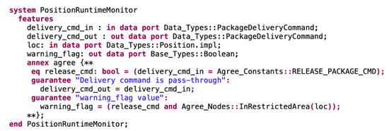 The AADL language allows one to embed domain-specific languages for stating goals, behaviors, and other aspects of the system (e.g., security, safety) through the annex mechanism. One such annex is the AGREE annex [26] that enables one to encode finer-grained details about a system component’s behavior in the form of an assume-guarantee contract. Such a contract for a given component in general asserts that the component’s behavior guarantees certain formal properties when certain assumptions on the component’s inputs are met. Such a specification mechanism of a system’s behavior enables one to specify a system hierarchically and verify its fine-grained global guarantees compositionally. The semantics of the AGREE language can be defined with respect to an enhanced Lustre language [27], which is a synchronous dataflow language with extensions to write contracts of components of a system for compositional analysis. In our context, the AGREE language is heavily used for specifying the system behavior necessary for the analysis by the CRV functionality.