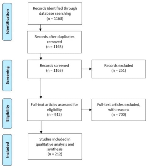 We identified 1163 papers, of which 912 were selected for full-text screening. Altogether, 212 papers passed the full-text screening.