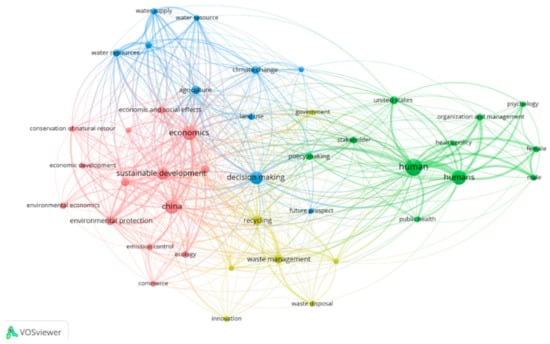 The outcomes in Figure 2 and Figure 3 indicate that three basic clusters can be identified. First, a considerable number of studies belong to a group focusing on environmental issues and nature-related topics such as water usage or waste management. Due to its size, this cluster needs further detailed structuring into new independent groups or subclusters during the further analysis. Second, papers dealing with various topics from business and the economy are identified. Third, health-oriented papers represent another cluster, in which topics such as specific diseases or public health-care systems or policies are analyzed.