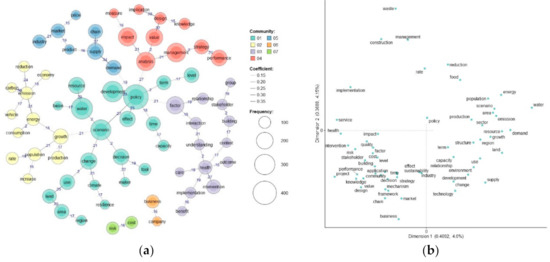 Examples of outcomes from the text-mining analyses: (a) co-occurrence network, terms frequency 50; edge distance Jaccard; (b) correspondence analysis of words, terms frequency 70, chi-square value top 60.