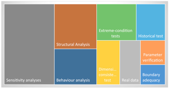 While analyzing published papers, one specific concern arose. From the methodological perspective, there are various types of tests that need to be or should be conducted. Models and their simulations have to be supported by verifications of their validity, robustness, and meaningfulness. Figure 4 provides a list of tests that were used for the model building and verification. Only papers that mentioned any type of test are included. Papers in which conducted tests were not presented or were not even conducted are excluded. The question is whether papers that do not provide methodological details should be published. Of course, models could have been appropriately built and tested, but without the methodological details appearing in the paper, future replication and reasonable model tuning are almost impossible. Sensitivity analysis is the most common method of testing, followed by structural analysis. The issue is that while structural analysis helps to verify a developed model, sensitivity analysis is used merely for analytical purposes without aiming to polish the model. The historical test and a real data test are separated because of separation in papers (fundamentally, these tests work based on the same principle). All these tests were conducted on models developed, in fact, predominantly using two software applications, Vensim and Stella (in various versions of these products). While the vast majority of models were associated with Vensim, other tools such as Powersim Studio, Anylogic, and Netlogo were used sporadically. These two findings are strongly interrelated, as some software applications provide a wide range of usable tests while others provide only a few.