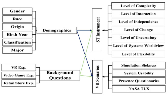 - Developing a set of VR gaming scenarios to measure the ST skills of the students based on the systems skills instrument by Jaradat [15]. In this study, the proposed VR scenarios were developed to measure only the first dimension of the instrument, level of complexity—simplicity vs. complexity (see Table 2). Six binary questions were used to determine the complexity dimension level.