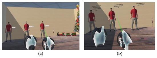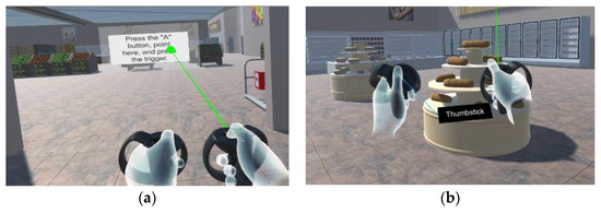 The VR scenarios started with an identification window where the assistant entered the participant ID and selected a mitigation type. To begin the VR scenarios, the student was asked to “Click the A button to start” by pointing the laser at the caption, as illustrated in Figure 2a. Oral instructions that were provided to facilitate and direct the participants’ interactions could be activated/deactivated during the simulation. The first audio recording began after pressing the caption and indicated how to move and interact in the scenes using the buttons and triggers on the touch controllers (see Figure 2b).
