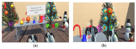 (a) First UI to start the Christmas decoration scene. (b) Placing ornaments on the Christmas tree.