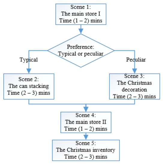 A total of 30 participants participated in this study based on immersive VR scenarios for systems skills thinking. The users were not allowed to wear the headset until they felt comfortable in the virtual environment before beginning the assessment. The first scene (the main store I) began with audio and closed-captioned instructions for the user, and the user was shown how to select the “Begin” button to start the assessment. This method of selecting objects and progressing forward in the assessment was repeated throughout the entire VR scenarios. Figure 7 below shows the data collection flow of the entire study and Figure 8 depicts the flow of VR scenarios.
