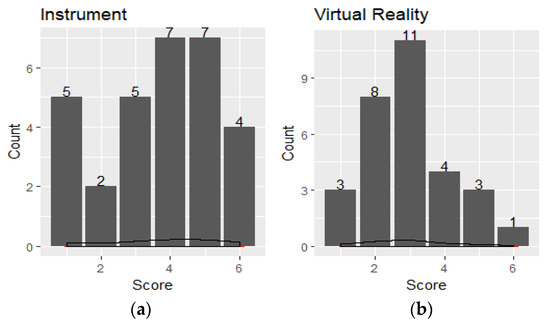 The score of the high-systematic skills for each participant ranged between 0–6, and the distribution of scores is shown in Figure 9. The shape of the distribution of the ST skills instrument and ST skills VR scenario scores were non-normally distributed. The average score of the ST skills instruments (Mean (M) = 3.57, Standard Deviation (SD) = 1.736) was higher than the participant’s average score in the VR scenarios (M = 2.97, SD = 1.245).