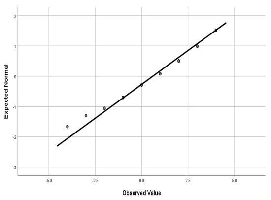 To investigate the mean score differences between the ST skills instrument and the VR scenarios, a paired sample t-test was performed under the normality assumption. First, the Shapiro–Wilk normality test confirmed the normality of score differences for the matched pairs in both scoring sheets (W = 0.954, df = 30, p = 0.213). Additionally, the Q–Q plot was plotted to confirm the normality of the score differences, as shown in Figure 10. Both the plot and the normality tests confirmed that the distribution of data was not significantly different from a normal distribution.