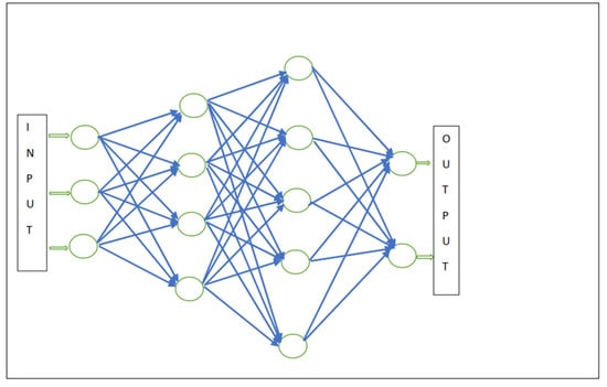 An example of non-explicitness is sub-symbolic computing in ANN [,,,]. This involves multi-layered weighted nets according to which the computation is distributed. The computational processing is represented in a non-analytical way through levels and weighted connections whose weights can change contextually during the process [], as schematized in Figure 1.