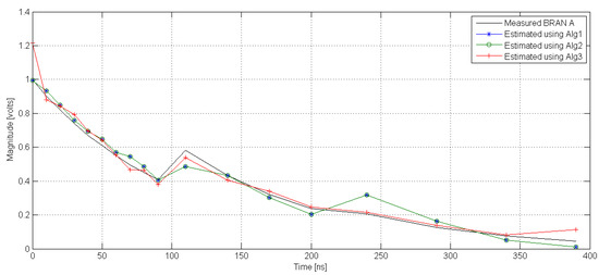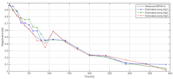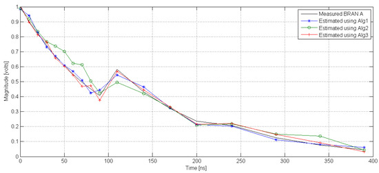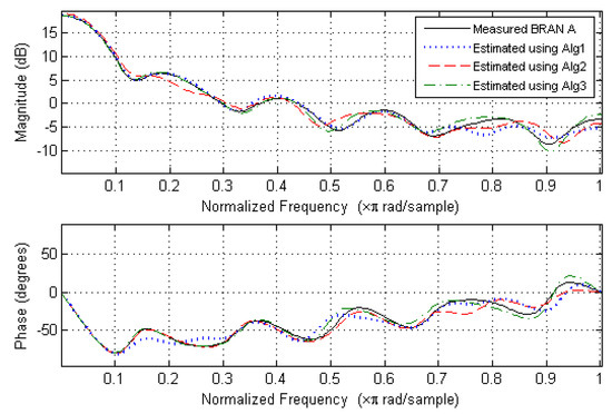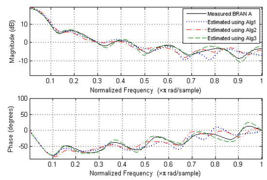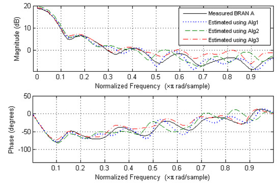 Figure 11, Figure 12 and Figure 13 represent the results of the estimation of the amplitude and phase by comparing the measured parameters of the BRAN A channel and the parameters estimated using the algorithms based on cumulants (Alg1, Alg2, and Alg3). It should be noted that the algorithms based on cumulants provided remarkable performance. Indeed, if dB, we obtained good results with the algorithms based on cumulants, but if dB, we observed that the algorithms based on binary measurement gave us better results than the algorithms based on cumulants. It must be emphasized that the algorithms based on cumulants are simple and have the advantage of identifying the parameters with a low calculation cost and without knowledge of the input (blind identification) in comparison with the methods based on binary measurement, which require the use of the input and output of the channel.
