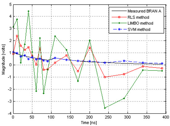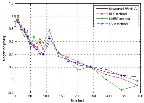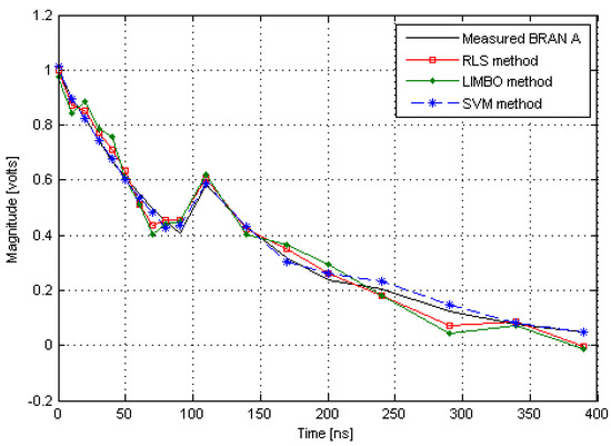 In Figure 6, we show the estimations of the BRAN A parameters by using the RLS, LIMBO, and SVM methods in the case of dB and with a data input of . In this case where the noise is not very important, we remark that the results obtained using the RLS and LIMBO methods were closer to those obtained in the case in which noise was important ( dB); this result can be explained by the fact that the rounding errors due to the noise were minimal, which implies an improvement in the results obtained.