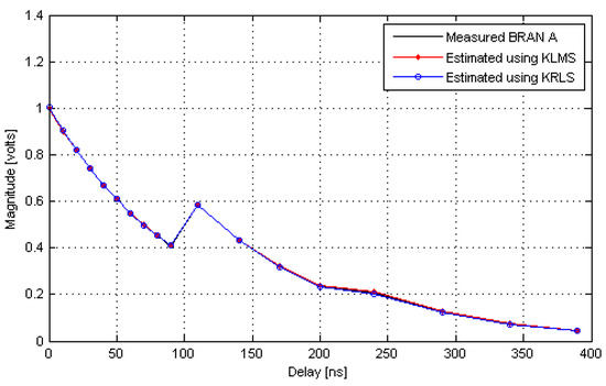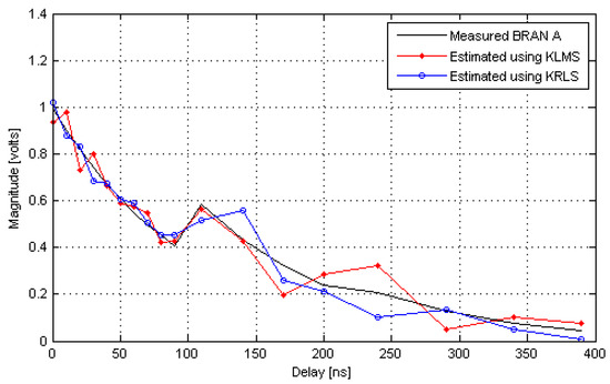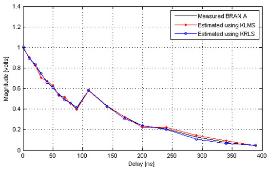 Figure 8, Figure 9 and Figure 10 show the estimation of the impulse response parameters of the BRAN A channel as a function of the path delays by using the kernel-based algorithms for different values of and .