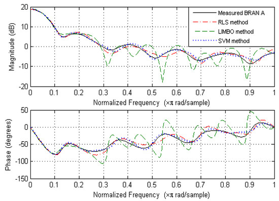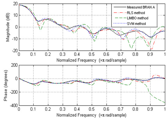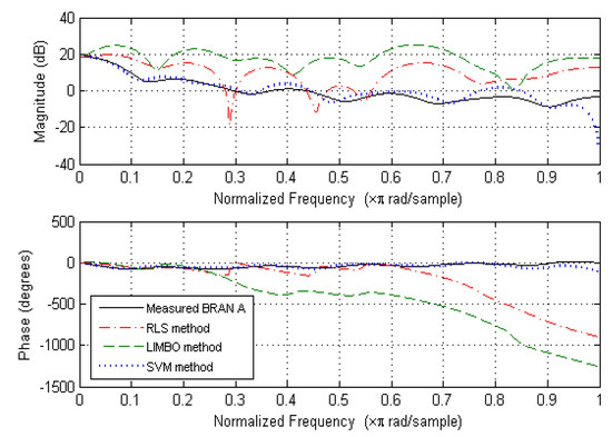 Estimations of the BRAN A magnitude and phase using the RLS , LIMBO , and SVM methods for dB and .
