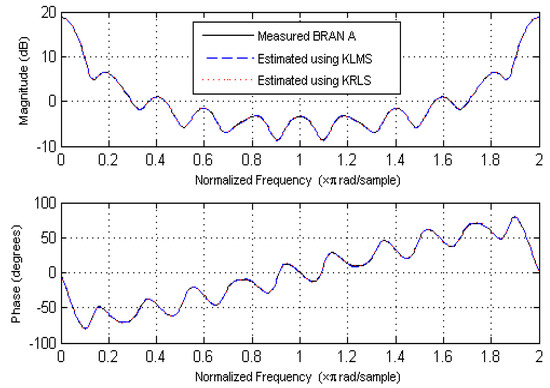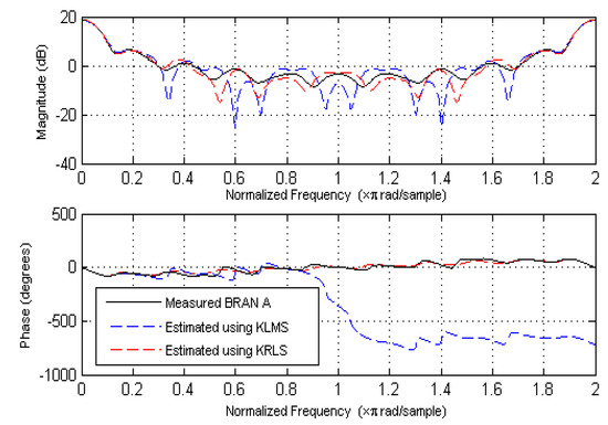 The curves in Figure 17, Figure 18 and Figure 19 show the estimations of the amplitude and phase of the BRAN A channel by using kernel methods (KRLS and KLMS) for a data length of and for different values of . In Figure 17, Figure 18 and Figure 19, we present the performance of the KRLS and KLMS algorithms. We observed that the KRLS algorithm performed better than the KLMS algorithm, which produced quite large errors. We can conclude from Figure 17 that the phase of the BRAN A channel’s impulse response estimated by the KRLS algorithm was closer to the true values. However, when using the KLMS algorithm, the difference between the measured and estimated phase was significantly larger.