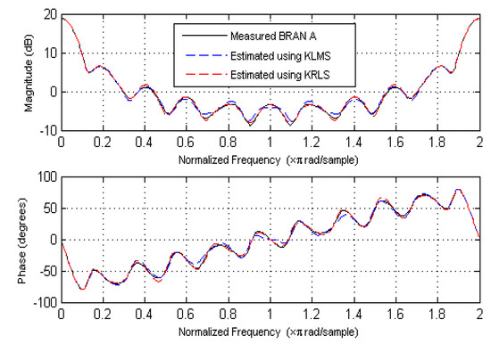Estimations of the BRAN A magnitude and phase using KRLS and KLMS for dB and with the Gaussian kernel .