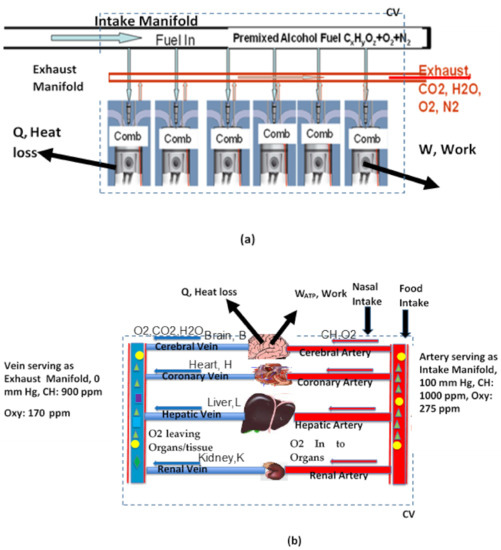 Illustration of energy conversion processes within Thermal Systems and Biological Systems. (a) Multi-Cylinder Automobile Engine: For the control volume (CV) indicated, fuel and O2 enter the system, and exhaust products CO2, H2O and unused O2 leaves the system. A part of the energy released is converted into work (W) and the remainder is released as heat (Q); (b) Multi-organ BS: Each organ is like a cylinder in an automobile engine. For the control volume (CV) indicated, food enters through mouth and is converted into nutrients CH, F, and P, and O2 breathed through the nose joins the blood stream. Thus, premixed fuels CH, F, and O2 enter the blood stream and are transported to vital organs Br, H, K, and L, Exhaust products, CO2, H2O, and unused O2 leaves the blood stream, enters the lungs, and become exhausted. A part of the energy released from each organ is converted into ATP (equivalent to work, W) and the remainder is released as heat (Q). pA,O2 in Alveoli: 104, pO2 in tissue capillaries is typically 40–50 mm Hg with O2 {saturation level almost at 60%}.