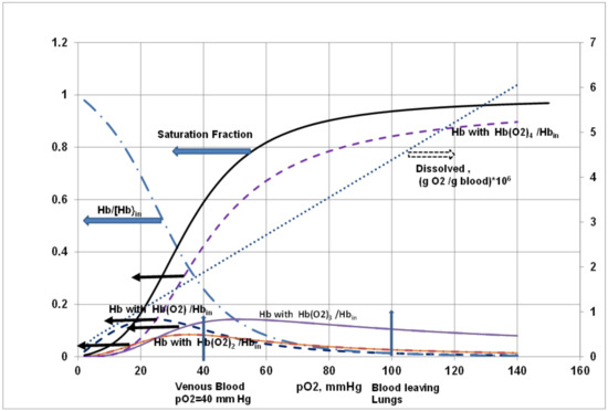 Variation of the (i) saturation fraction, (ii) (Hb(O2) n)/(Hb)in, (iii) dissolved O2, and (iv) amount left over (Hb)/(Hb) in pO2, A in the alveoli (≈pO2,a in the artery of the blood stream). Dissolved YO2 in the blood (g per g blood = . The saturation fraction is 0.94 at pO2,A≈ pO2,a = pO2 = 100 mm of Hg. Normal saturation levels: 92–98%; hypoxic if Sat.% < 90%; organ damage if Sat. < 80%, loss of consciousness if Sat. 75%, In COVID-19 patients, saturation level ranges from 50–90% [11] due to “excessive” clotting in blood vessels. Figure 2 adopted from [12] and modified. Normal (Hb)in = 160 mg per L of blood and 3 mL of dissolved blood per L of blood (1 mL of O2 at CST = 1.42 mg).