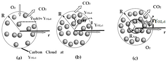 An example of the Spherical Carbon Cloud of radius R subjected to YO2, cl or YO2, R and cloud temperature, Tcl, at cloud surface; instead of YO2R, sometimes the dust cloud is exposed to an ambience at YO2∞. (a) Diluted Cloud (n is extremely low): Isolated Combustion Mode with uniform O2 concentration at YO2, cl. (b) Dense Cloud: Interactive Combustion Mode with a decreasing O2 concentration within the cloud with a non-uniform O2 consumption per unit volume. (c) Very Dense Cloud: Combustion of cloud with an anaerobic core of radius Ran where the O2 concentration is almost zero. Volume/surface area = R/3.