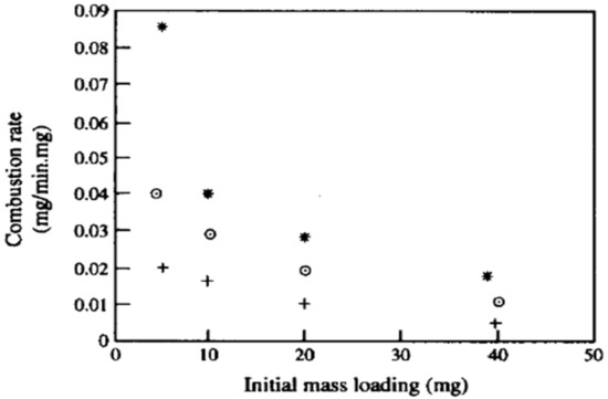 The effect of mass loading and oxygen concentration on the specific combustion rate (SCR) of black soot particles. SERR ∝ SCR. Oxygen effect at 600 °C +: 5% (volume): ⊙ 10% (600 °C) and ✸: 15% O2 (adopted from [30]).