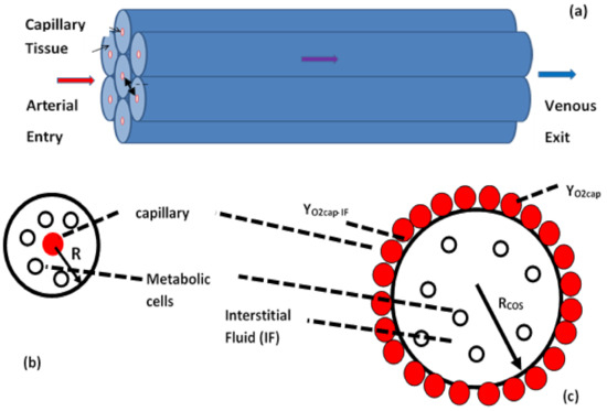 Oxidation Models for Organs: Oxidation of CH within each organ is modeled as though an organ is made up of a group of multiple cylinders of radii, R (Figure 5a) that contain metabolic cells supplied with oxygen from a capillary of radius rcap at YO2cap located at the axis of each cylinder (Figure 5b). This model is known as the Krogh Cylinder model [38] and could be re-termed as the capillary on axis (COA) model. For a detailed review of Krogh models, see Ref. [39]. Each cylinder contains metabolic cells immersed in interstitial fluid (IF, the bulk phase in the cell cloud) (Figure 5c). Typically, the mixture in capillaries is CH rich and the oxidation is essentially controlled by diffusion of dissolved O2 from capillaries to the IF and by the kinetics of oxidation within cells. Under kinetics control, Michaelis Menten kinetics are used for oxidation within MITO: CCh,k, is known for each organ; the constants depend on Michaelis Menten (MM) constants kMM, in kinetics expression.