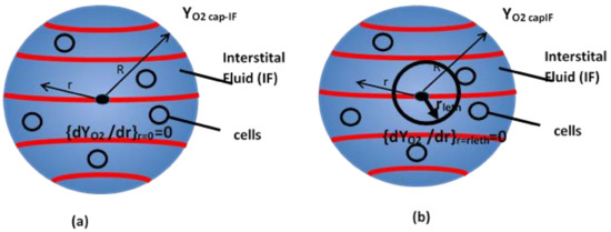 Illustrations of the COS-O2 model in spherical geometry with the solid lines representing the capillaries. (a) No lethal volume, (b) lethal volume near core. Under poor oxygenation such as in COVID-19 where saturation percentage is as low as 50%, lethal volume percentage is much higher compared to a normal healthy person.