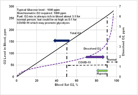 Oxygen contents in the blood versus the saturation % in arterial blood in ppm or g per million g of blood. Saturation % for COVID patients range from 50–90%. It is apparent that COVID-19 patients receive less oxygen in their blood at 50% saturation, and particularly dissolved blood, which is transferred to mitochondria resulting in concentration as low as about 2 ppm, leading to oxygen deficiency. Further, the blood becomes richer in glucose, thus cells do not receive an adequate oxygen supply, resulting in a reduced ATP production per cell.