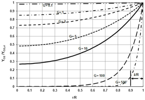 Appendix A presents the solution for oxygen concentrations when the lethal volume is finite (Equations (A2) and (A3)). When ξleth is set to zero in Equation (A2), one recovers the solution for YO2 without lethal volume. The non-dimensional solutions for the oxygen mass fraction for carbon clouds and cell clouds are given in row 9 and 10 for cell clouds While O2 mass fraction ranges around 300 ppm for healthy humans, the total YO2 could be as low 150 ppm and dissolved O2 as low as 1.5 ppm at 50% saturation (Figure 8) for COVID-19 patients, indicating a very rich mixture of CH and O2. Low O2 concentration results in an increase of lethal volume within each vital organ. Detailed solutions for metabolic rates and extent of lethal volumes have been obtained for cell clouds involving slab, cylinder, and spherical geometries. However, the subsequent sections deal with presentations of solutions of a spherical cloud without lethal volume so that the methodology for deriving allometric laws of organs from effectiveness factor charts and validation of Kleiber’s law for the whole body can be kept in a tractable form. Figure 9 presents O2 profiles with G (carbon clouds) or GOD (cell clouds) as parameters. At low GOD, the profile is almost flat, indicating a uniform O2 consumption. They become steeper at high GOD, indicating an aerobic shell of thickness δ near r = R while most of the inner cloud is anerobic.